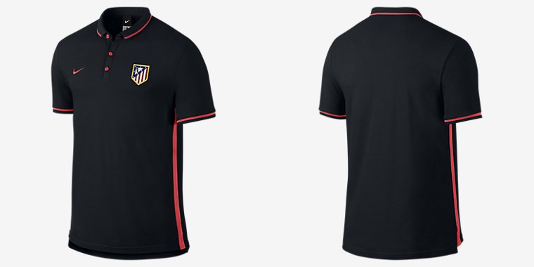 黒を基調としたシャツに、赤のラインを入れることでスタイリッシュなデザインとなったアトレティコのポロシャツ。
