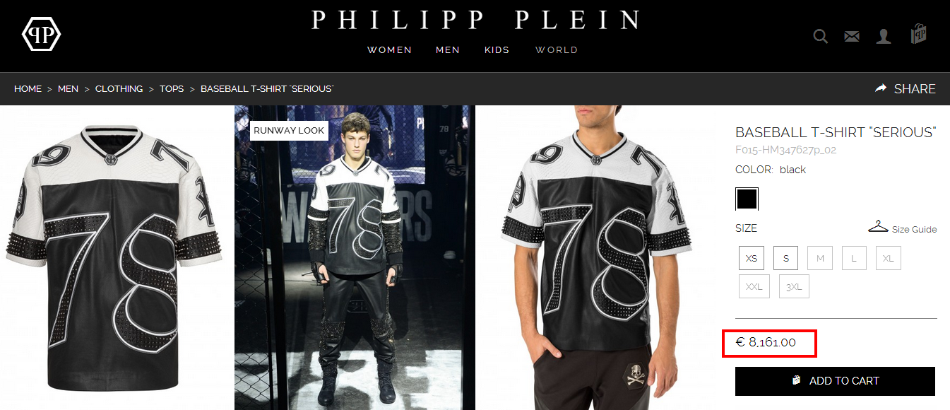 安くても300ユーロ(およそ4万円)以上するフィリップ・プレインのトップスのラインナップだが、最高価格のTシャツ1117ユーロ(およそ15.2万円)。
