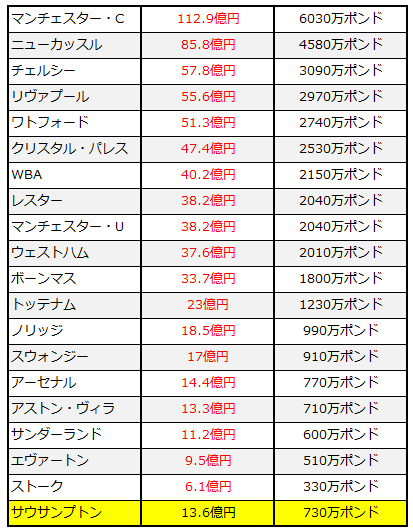 Spentが出費、Receivedが収益、Net Spendは赤字。20チーム中19チームが赤字のなか、唯一サウサンプトンだけが現時点では収支がプラスだそう。