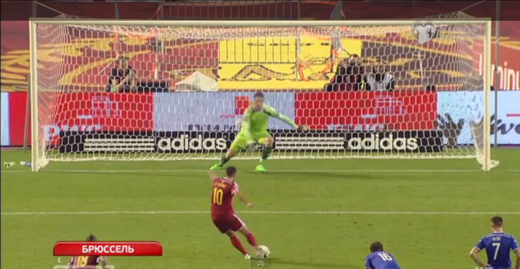 しかし、アザールはただ単に左に蹴ったわけではない。蹴る方向を決めていたためか、かなり厳しいコースを狙っている。