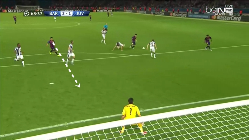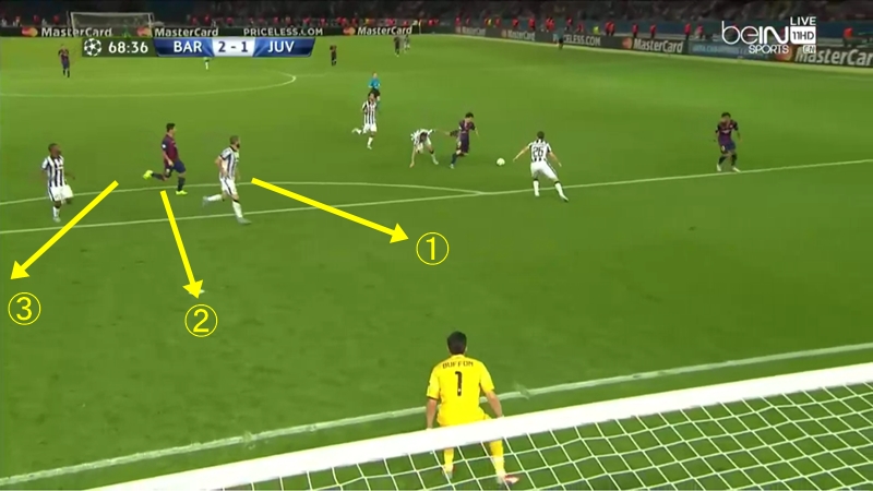 メッシが決定機を迎えたことを確認したスアレスは、まずブッフォンの状態を把握。そして、瞬時にファーサイドのスペース、つまり3のコースを取ることが一番得点の確率が高いと判断し、結果それは正しかった。