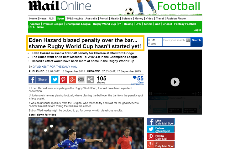 記事ではアザールのPK失敗についてのみ触れられているのだが、見出しには「エデン・アザールの燃え盛るPKはクロスバーの上へ…ラグビーワールドカップがまだ開幕していないことを恥じろ!」とある。