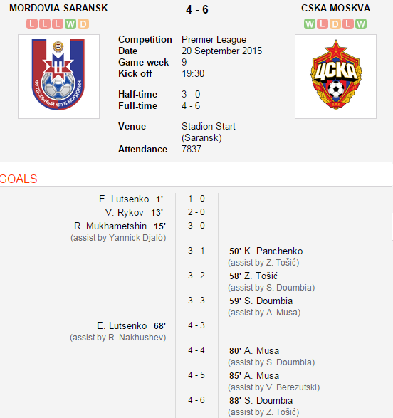 ロシア・プレミアリーグ第9節、モルドヴィア・サランスク対CSKAモスクワ戦は壮絶な点の奪い合いとなった。