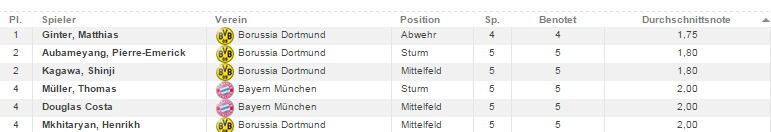 『Bild』において、香川は5試合終了時点で全体2位タイという高評価であった。