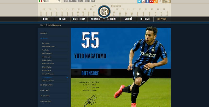 下部にはゴール動画、出場歴などが見れミランを現代風にブラッシュアップした印象を受ける。