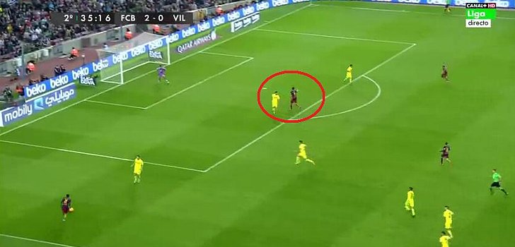 ネイマールが左サイドでボールを受けた時、オフサイドラインをやや超えたところで息を潜め、DFラインの戻りを静かに待つスアレス。