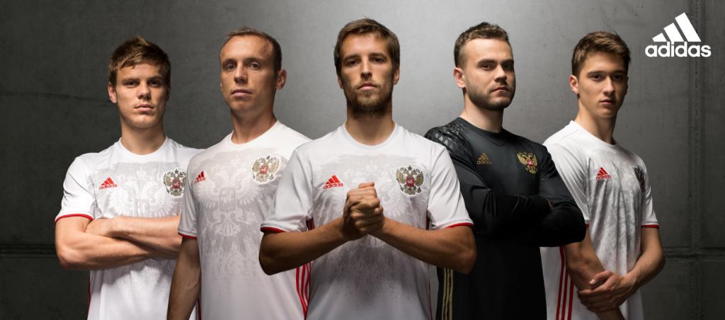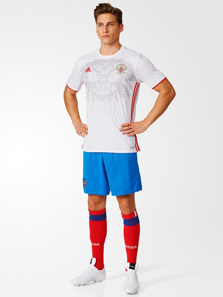 アウェイは白いシャツに青パンツ、赤ソックスという組み合わせ。ロシアの国旗カラーを表現したコーディネートは、Nike時代の2006-07ホーム以来となる。