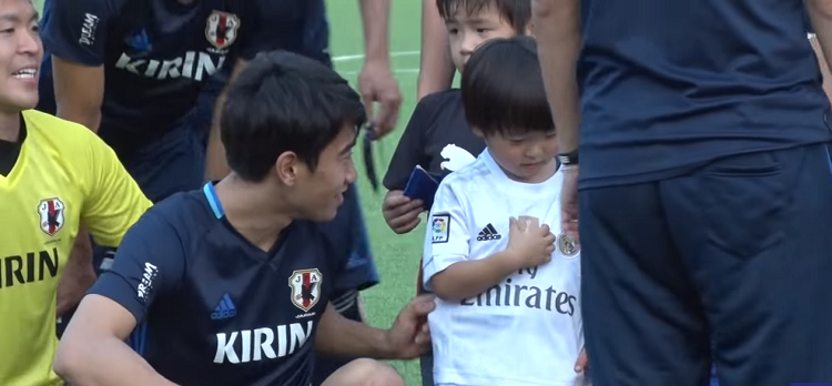 レアル・マドリーのユニフォームを着た少年に何かを囁く香川真司。