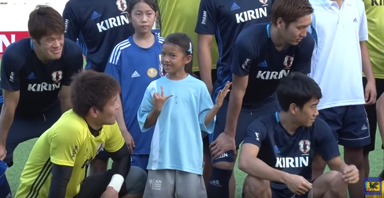 JFAによれば、約70人の小学生が練習前に選手たちと触れ合う機会を得たのだそう。選手たちと記念撮影を行い、記念に選手のサイン入りペナントを受け取ったのだという。
