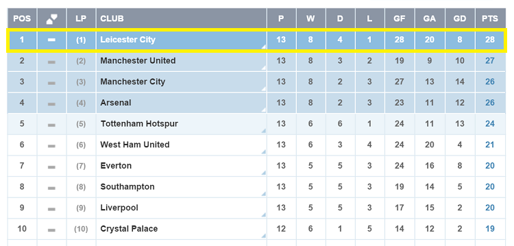 プレミアリーグは13節を終了している。ここまでの順位表はこの通り(トップハーフ)。