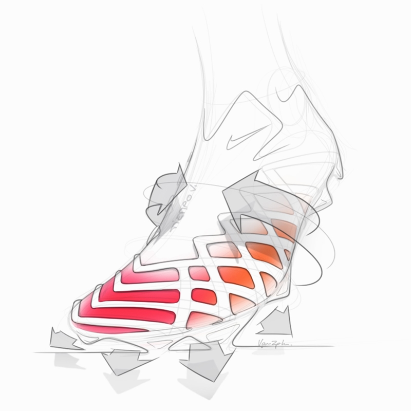 アッパーの後足部にも黒いサポートケージを追加。高いボールコントロール性のためヒールを巻くように配されたクッション性のあるケージは、デザイン的な特徴ともなっている。