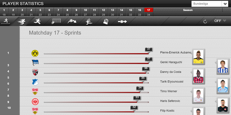 こちらは、第17節に行われた全選手の中で、スプリント回数が最も多かった上位10名だ。原口はドルトムントFWピエール・オーバメヤングと並びトップの「37」を記録している。