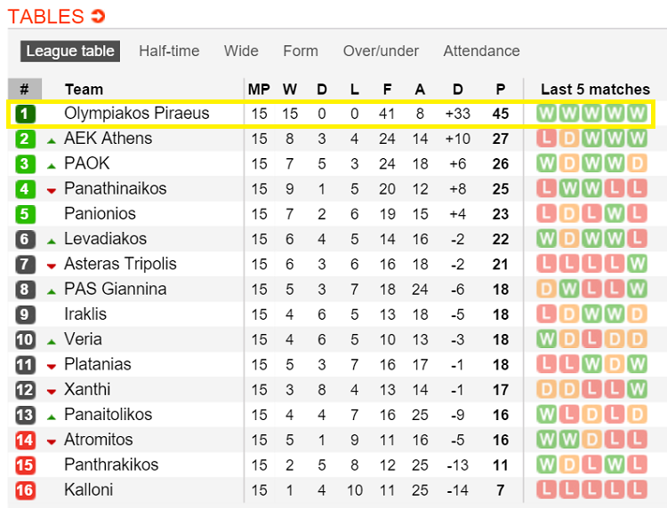 首位を走るのはやはりオリンピアコスなのだが…なんとこの前半戦の15試合を15勝0分0敗で切り抜けたのだ!