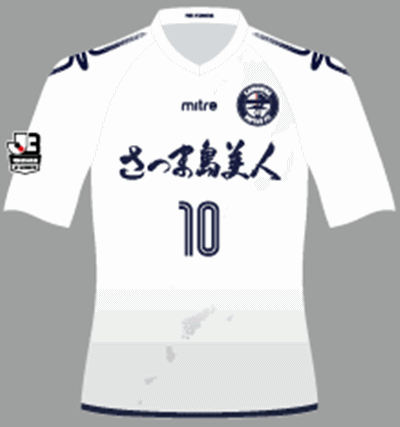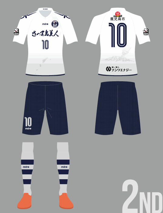 アウェイ(2nd)は、これまでホームで使用していた白を基調に、ライトグレーのグラデーションで“火山灰の強さ”をプラス。正面には奄美群島のモチーフも見える(※右上には九州南部も。「桜島」と同じくすべてのユニフォームに入れられている)。