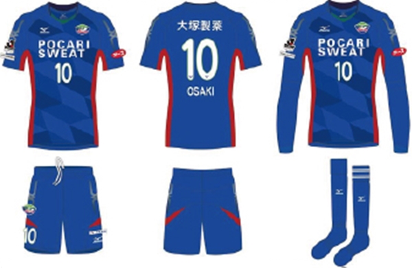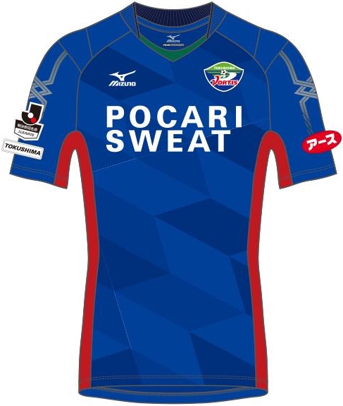 ホーム(1st)は、クラブカラーで藍染めが盛んだった吉野川を表す青を基調に、徳島市のシンボル的存在である眉山の緑を胸元の襟に配置。また、両脇からパンツにかけての赤いラインは結ぶとVORTISの“V”になり、エンブレムを表現している。