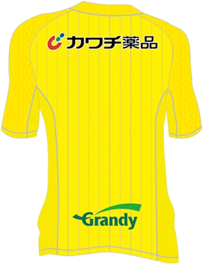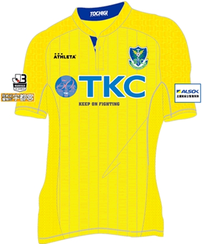 ホーム(1st)は、伝統の黄色を基調に青のピンストライプ柄を施したデザイン。袖には栃木県の県章を模したパターンを透かしで配している。
