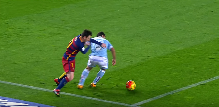 並走を始めた頃から、ホニは終始メッシに近い距離を取りまずまずの対応を見せていた。しかし、ボールを奪おうと足を出したその瞬間をメッシは狙っていた。