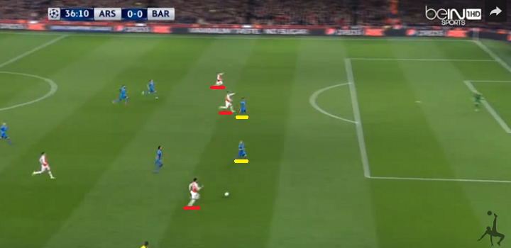 36分、ジョルディ・アルバからのクロスをアーロン・ラムジーが跳躍力あるジャンプでクリアし、アーセナルのカウンターに。