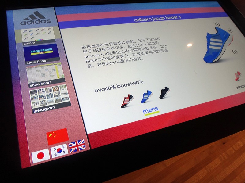 高機能タッチパネル「Shoe Bar (シュー・バー)」は、シューズの詳細データを瞬時に表示。機能だけでなく色から選ぶこともできるほか、言語も英語、中国語、韓国語に対応している。