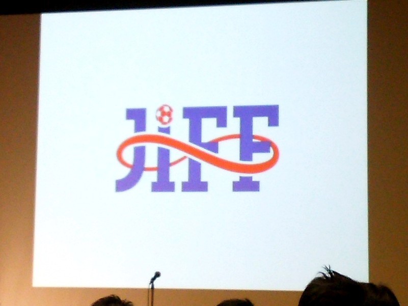 ≪ステージ前に映し出された「JIFF」のロゴ。中央の赤い輪は、「無限大の可能性」を示す「∞」の記号。同時に、JFAと障がい者サッカー7団体、合計8団体の連帯を示すとも≫