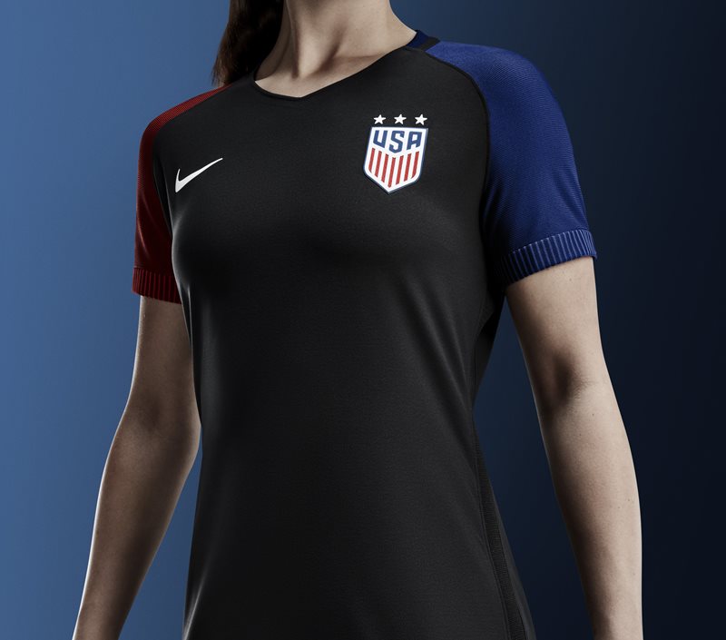 アウェイは黒を基調に、愛国心を表す青と赤を左右の袖にそれぞれ用いたデザイン。