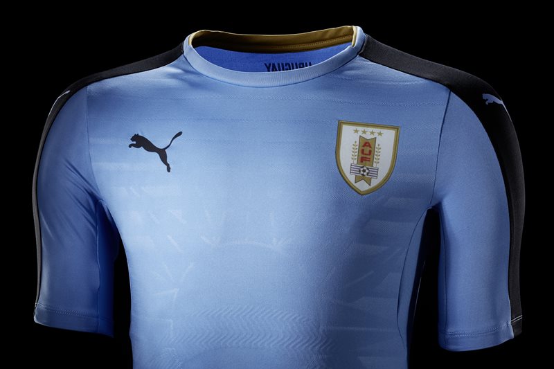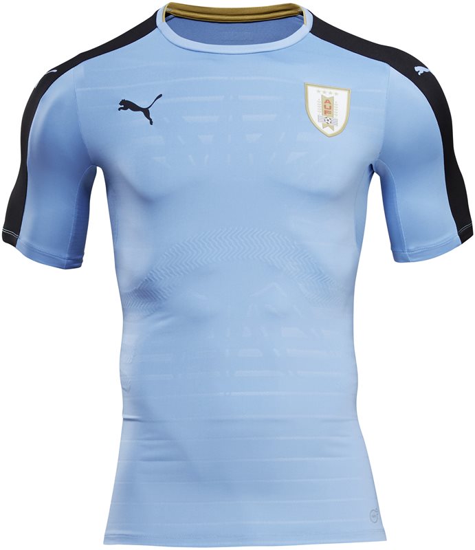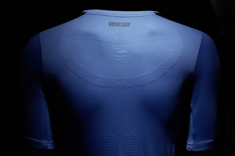 ホームは伝統の空色を基調に、肩から袖にかけて入れられた黒のアパレルフォームストライプが印象的なデザイン。身頃にはボーダー柄に加え、ウルグアイ国旗でもお馴染みインカ帝国の太陽神インティを象徴する「五月の太陽」が透かしが入れられている。