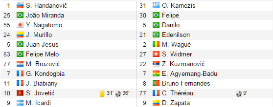 DF 長友(日本)、ミランダ(ブラジル)、ジェイソン・ムリージョ(コロンビア)、フアン・ジェズス(ブラジル)