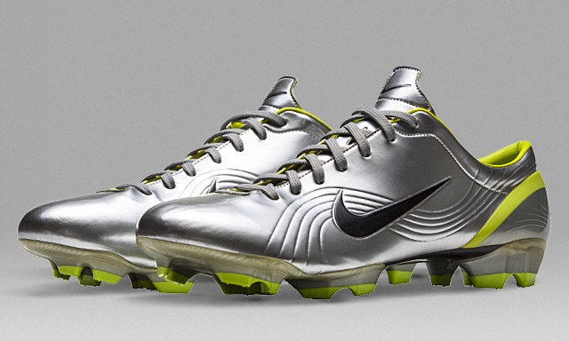 スピードを生み出すために陸上スパイクを参考にして作られた「ナイキ マーキュリアル」は1998年の夏に発表されました。軽量化のためにプレートは薄めに設計され、従来の皮革よりも薄く軽い合成皮革KNG-100のアッパーがフットボールスパイクの常識を変えました。ブラジルのアイコン的存在のロナウドが、フランスでマーキュリアルを初めて着用しましたが、大胆なシルバー、ブルー、イエローのカラーリングが現代フットボールにおける新しいスピードの表現となりました。