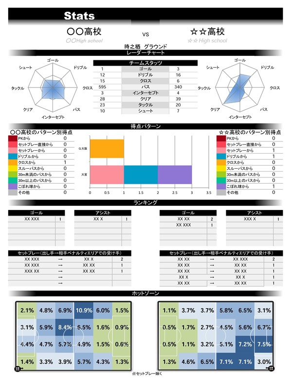 Jリーグでもお馴染みのデータスタジアムが協力し、U-13とU-16は国内のプロチームでも導入されているデータ分析システムと同じフォーマットでデータ取得をし、決勝戦に出場した両チームへ分析レポートを提供。U-11とU-12に関しては8人制のため、データ取得後、オリジナルの分析フォーマットでレポートを作成するという。