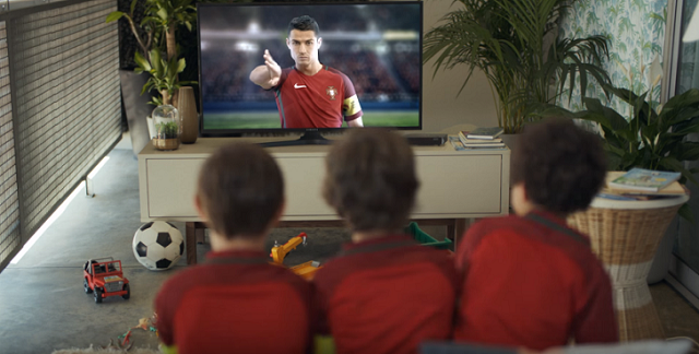 画面の中でロナウドはフリーキックを蹴るという設定で壁に入った選手を指示しているのだが、これにキッズたちが反応したというわけだ。こんな感じでサッカー観戦したら、なんだか楽しそう!