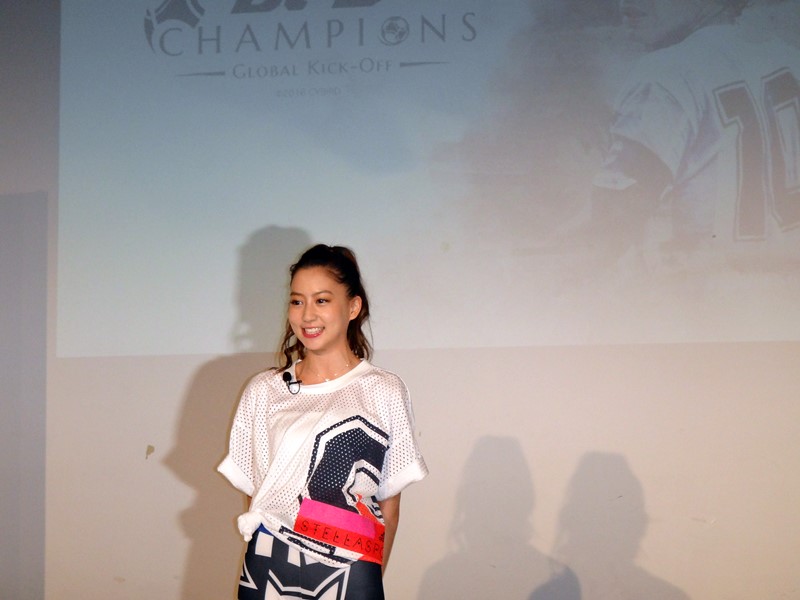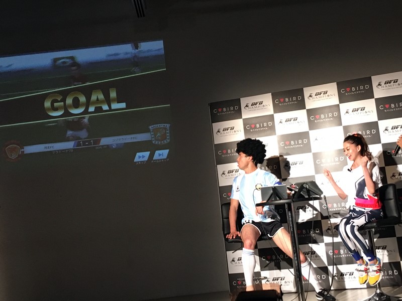 プレゼンテーションに続いて登場したのはタレントの河北麻友子さんと小島よしおさん。さっそく『BFB Champions』を体験し、二人による対戦では河北さんチームが見事なゴールでガッツポーズを見せた。