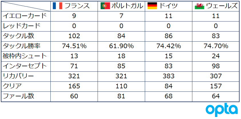 その中で光るのはフランスのタックル勝率74.51%であり、デュエル、空中戦に続いて高い値を示した。またクリア165はドイツの2倍の値を示している(ドイツは後方からクリアせずにつないでいくチームともいえるだろうが)。