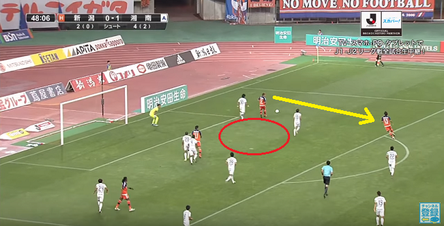 この時山崎の背後には島村毅が、加藤の近くには菊池大介がいたのだが、その意表を突いたパスに湘南の選手たちは対応することができなかった。