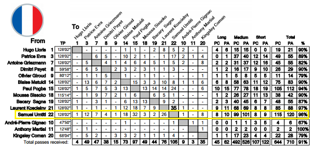 こちらは、誰から誰に向けたパスがどれだけあったかというグラフである。縦軸は出し手、横軸は受け手、その交点に記された数値がそれぞれのパス数だ。これを見てみると、ウンティティは全部で120本のパスを送りそのうち115本で成功。これは決勝戦に出場した選手のなかで最も多い数値だ。