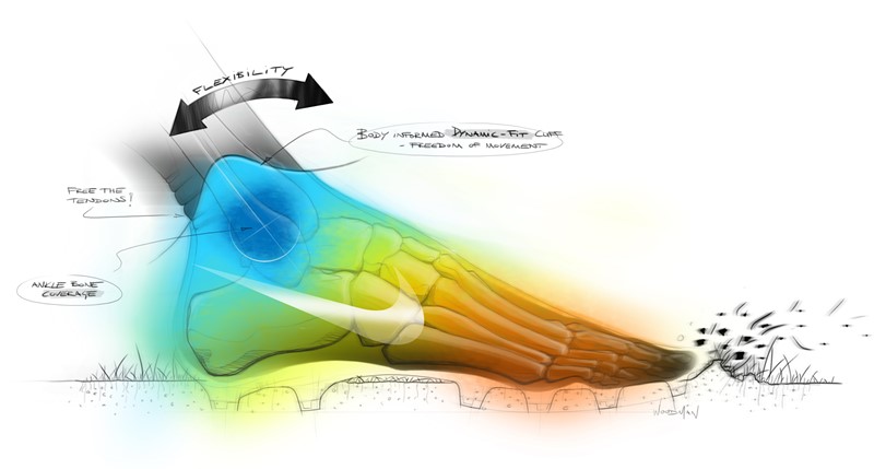 「マジスタ」を履くプレイヤーにとって、足を回転させる動きは重要なため、母指球の周囲にV字のスタッドを配置。これはNikeスポーツ研究所(NSRL)のFEAデータに基づいたもので、さらに加速のため半円柱系のスタッドが足の外側と内側に、かかとの安定感向上とスピードを止めるためのスタッドもそれぞれデータに基づいて配置されている。