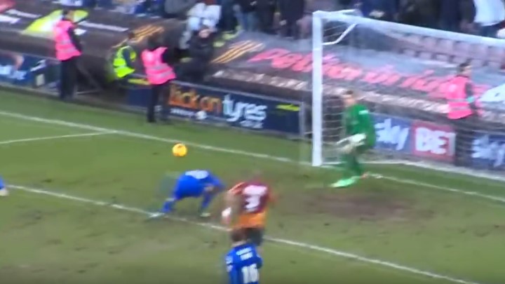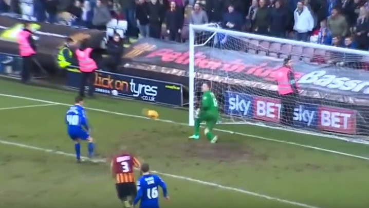 そのためボールに触りそうになったところを、後ろから声がかかったのか直前で神回避!入ってきた味方選手がゴールに蹴り込み、結果的にナイスフェイントとなった。