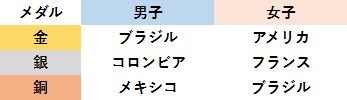 男子、ブラジル優勝は変えませんでしたが、銀メダルが何とコロンビア!アルゼンチンすら抑え、5度目の出場で初の五輪メダルゲットです。さらに、前回のロンドンで優勝したメキシコが3位に入り、2大会連続でのメダル獲得。