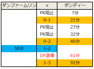 これは、凄すぎる…。さらにダンディーは後半途中にDFが退場になったほか、最後の3点目が決まったのは後半ATという時間帯でもあった。色々とすごい…。時系列にするとこんな感じ。
