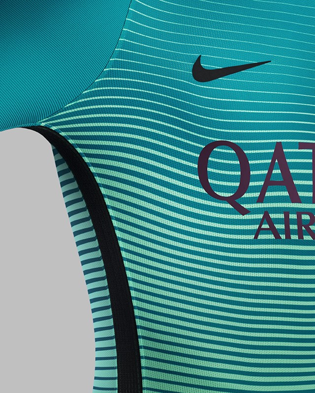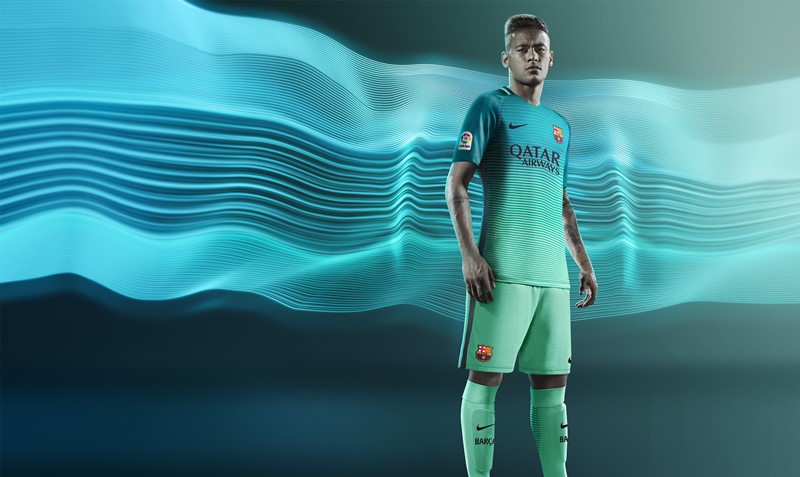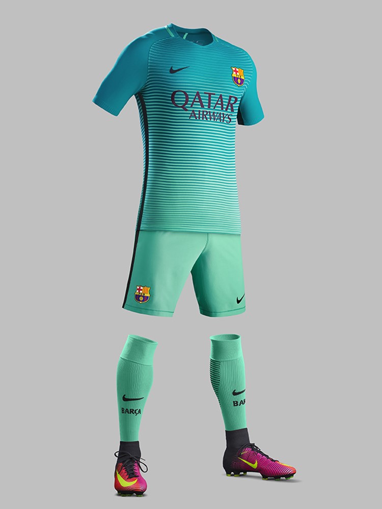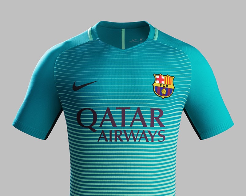 バルサの新サードユニフォームは、伝統的なアウェイカラーの一つである“青緑”を基調としたデザイン。