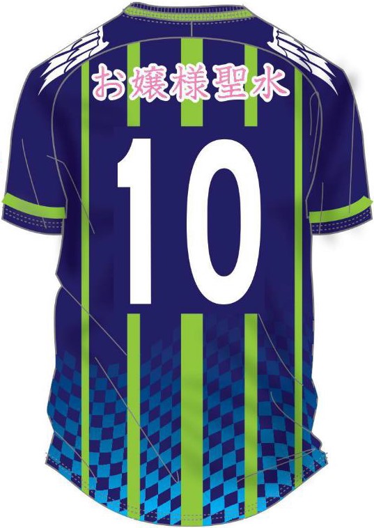 クラブカラーの青と緑を基調としたユニフォーム。“鈴鹿”らしいチェッカーフラッグ柄が印象的なデザインだが、背面がすごかった。
