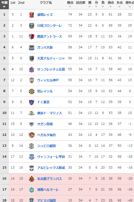 年間勝ち点1位は、2ndステージを制した浦和に決定した。