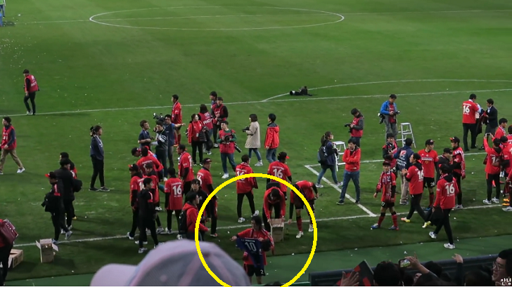 その後スタジアムでは優勝セレモニーが行われ、選手たちは喜びを爆発させていたのだが、高萩はこんなパフォーマンスをしていたようだ。