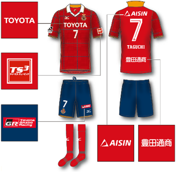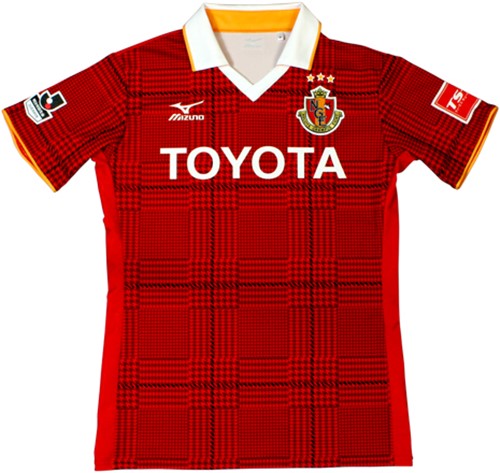 ホーム(1st)は、情熱・力強さ・積極性・ダイナミズムを表現した伝統のグランパスレッドを基調に、チームスピリッツカラー(バーバリアンレッド・ノーブルレッド・スターオレンジ)を組み合わせたデザイン。