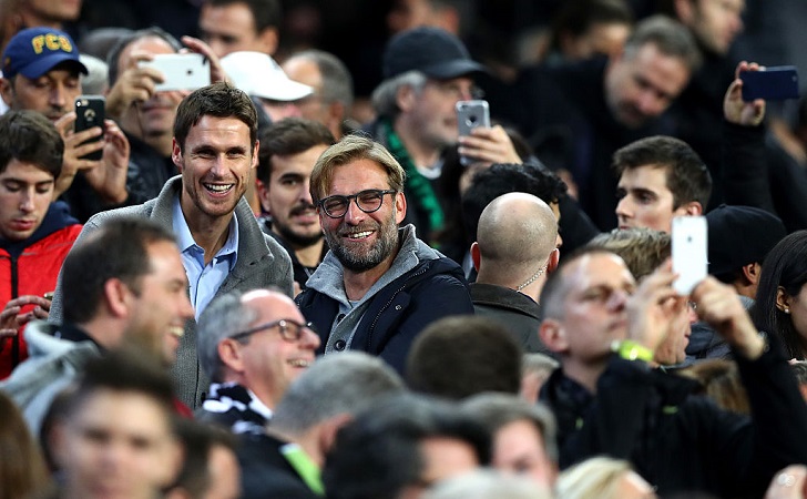 ユルゲン・クロップ監督の隣りにいるのは、ドルトムント時代に指導したセバスティアン・ケール。