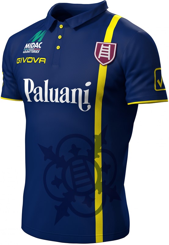 アウェイも素晴らしい出来。例年同様、13世紀から14世紀にかけてヴェローナの街に繁栄をもたらしたスカラ家の“梯子”がエンブレムとして使われているほか、正面にもスカラ家由来の紋章が透かしで配置されている。