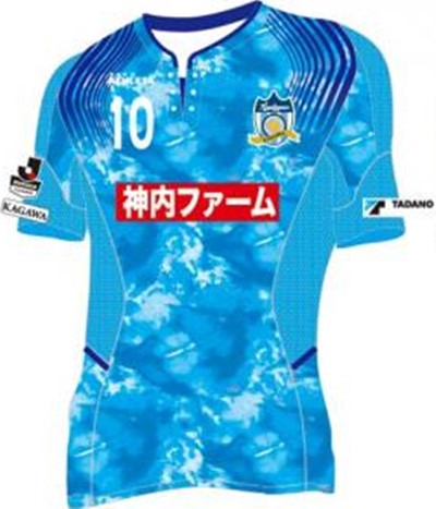 讃岐の2017シーズン新ユニフォーム、ホーム(1st)はカマタマーレのサックスカラーを基調に、多色のサックスをミックスしたデザイン(※原文ママ)。