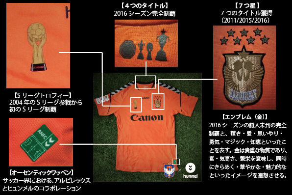 ホームは、「冒険」という意味合いも持つ伝統のオレンジを基調に、チャンピオンらしいゴールドを取り入れたデザイン。トロフィーや星だけでなくエンブレムも「前人未到の完全制覇と、輝き・愛・思いやり・勇気・マジック・知恵」を表すゴールド仕様だ。