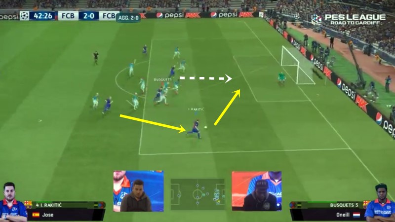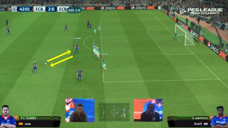 相手が中央へ寄ったところで右サイドへパスを出し、その間に逆サイドにいたネイマールが中央へ。最後はチームメイトムービング(※ボール保持者以外の選手をマニュアルで動かす操作。画像中央、右斜め上に向かって薄らと線が見えるのはこのムービングによるもの)でゴール前に突っ込ませてフライスルーパスから得点している。