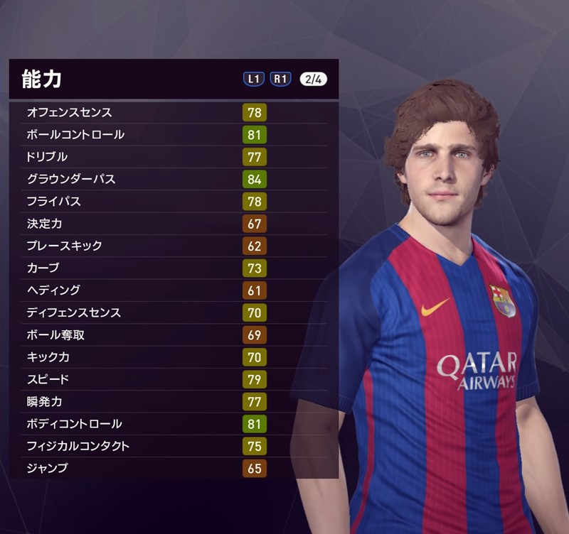 スタミナは82。決してピッチを走り回るタイプではないことが表れていると言える。