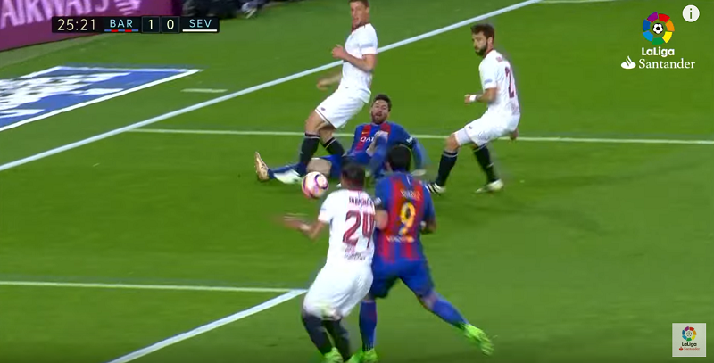 25分、リオネル・メッシがドリブルでペナルティエリアへと進入し中へボールを送ると、セビージャDFガブリエル・メルカドがクリアミス。
